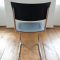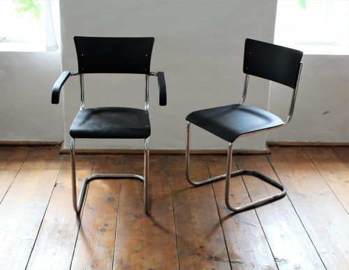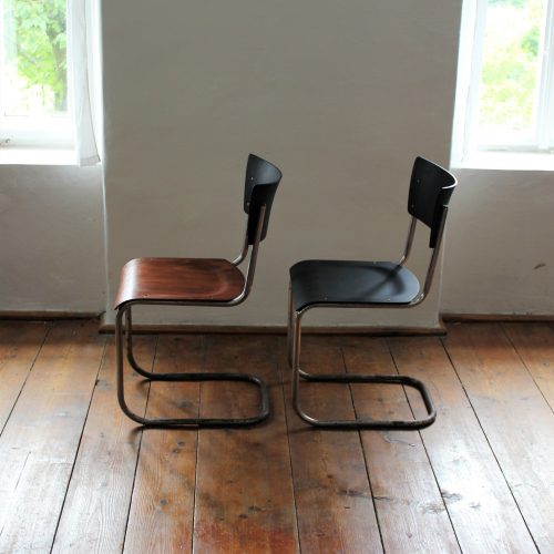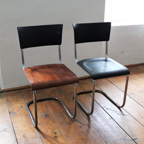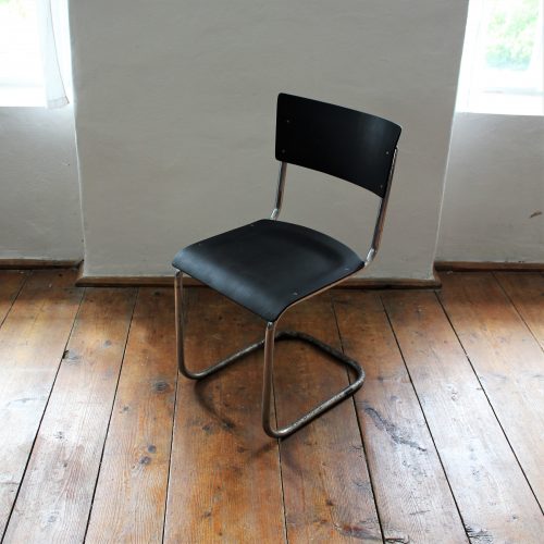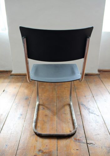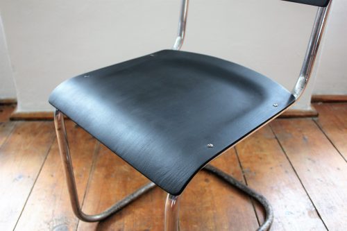 Kovová židle s dřevěným sedákem a opěradlem. Sedák i opěradlo ručně lakováno do černého matu. Kovová konstrukce v původním stavu, chrom místy zničen – zejména ve spodní části. Stylové sezení k pracovnímu stolu.