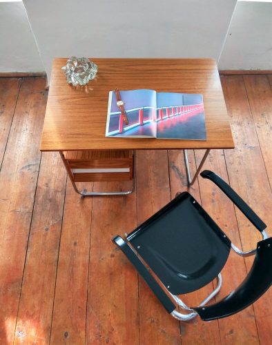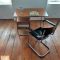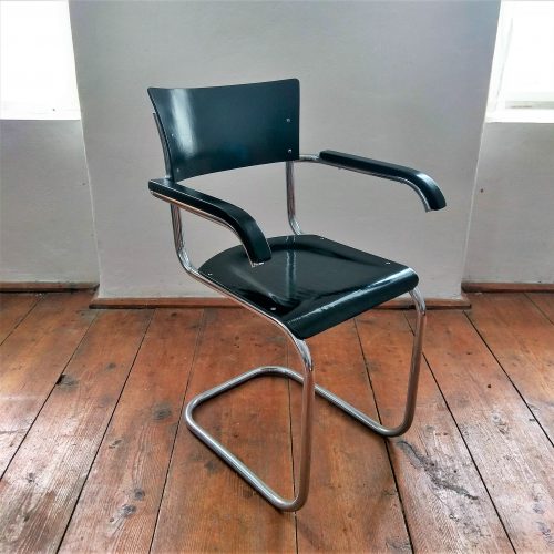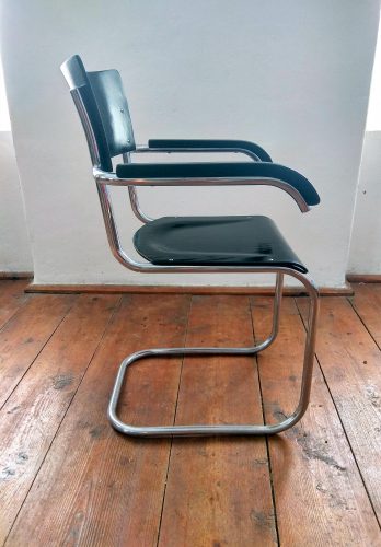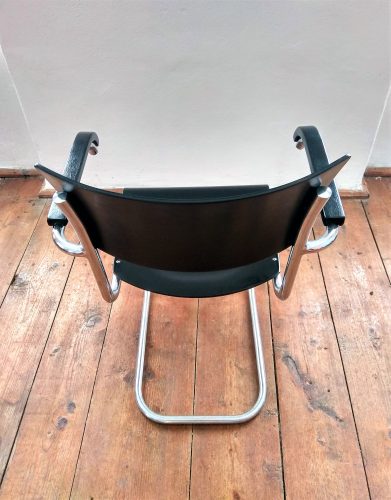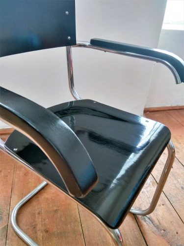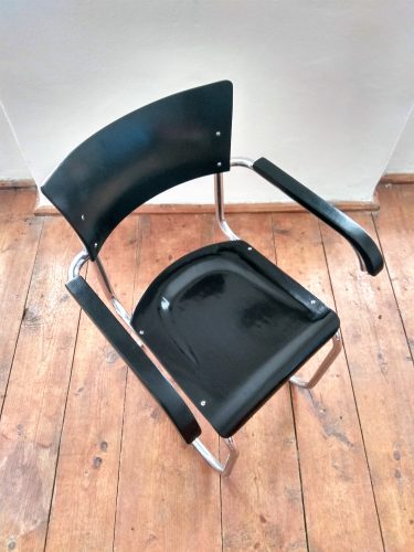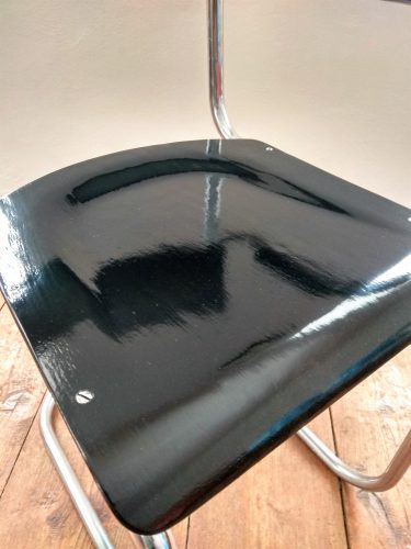 Kovová židle s dřevěným sedákem a opěradlem provedená v černém lesku. Sedák a opěradlo po renovaci. Kovová konstrukce v původním stavu, chrom přeleštěn. Stav chromu je naprosto vynikající. Židle je celkově ve velmi dobrém stavu. Krásný kousek k vašemu pracovnímu stolu.
