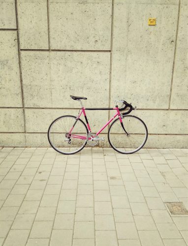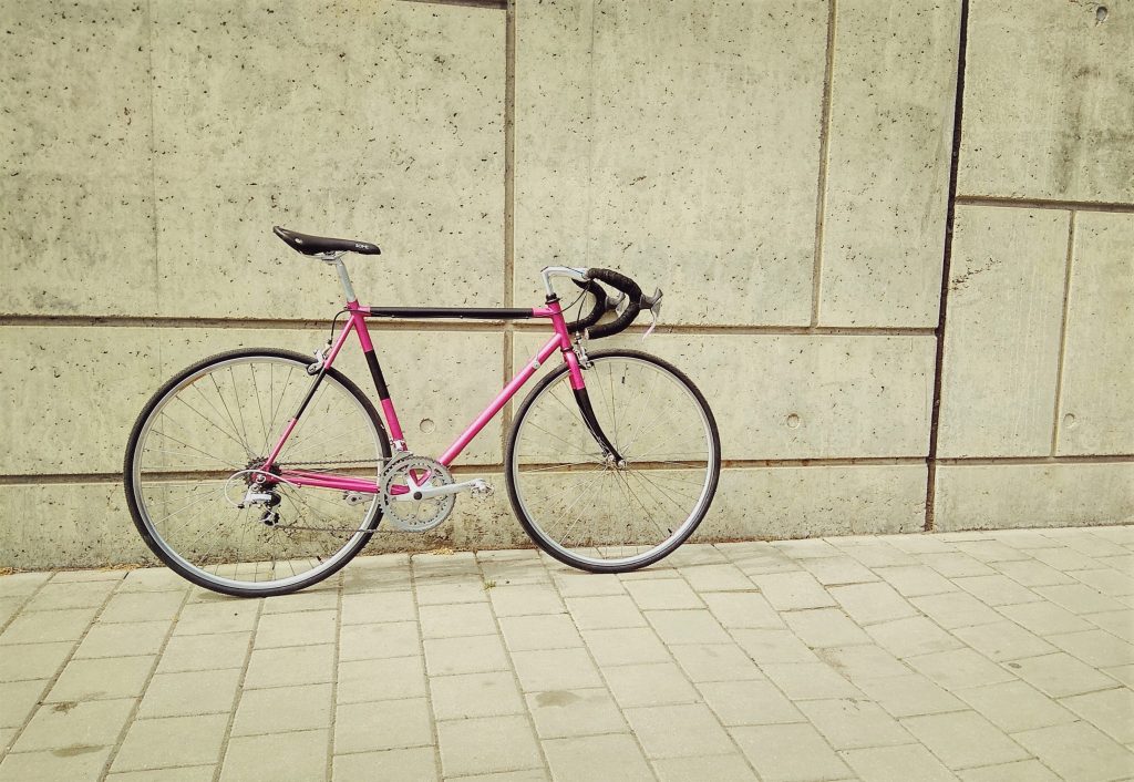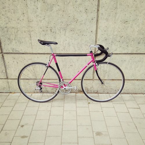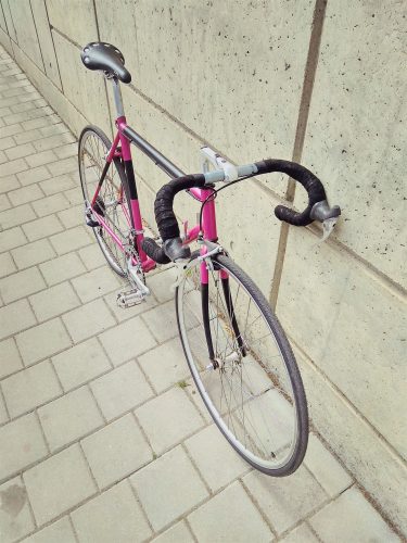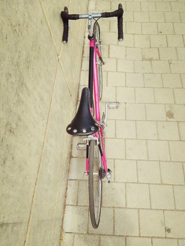 Ocelový fešák nejen do města. Postavený na českém rámu Reta. Rám je částečně nově lakovaný, ale převládá růžová barva „giro“.