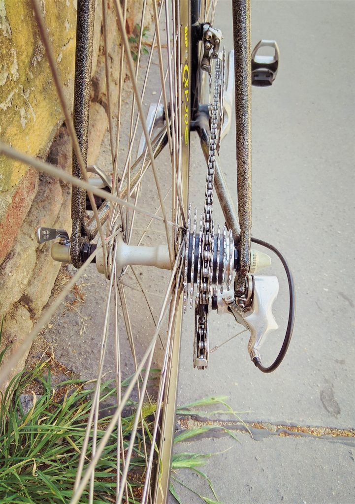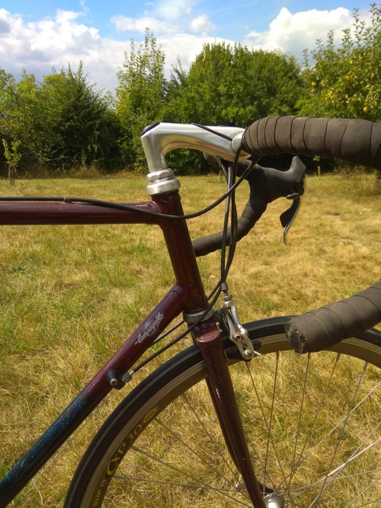 Komponenty (brzy, řazení, tác, přesmykač) Campagnolo Avanti z počátku 90. let – italská klasika. Řazení 2 * 8 je již dualové (brzdí se i řadí na říditkách), tedy o něco uživatelsky příjemnější než – li na rámu. Vyšší vintage ráfky značky Mavic CP30.