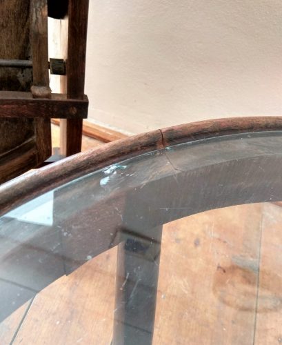 The table is in good condition. The table have signs of use. After agreement with the customer it is possible to replace the top glass plate, which is slightly chipped at one point (edge) – see photo.The current price is for the table in the current, depicted state.